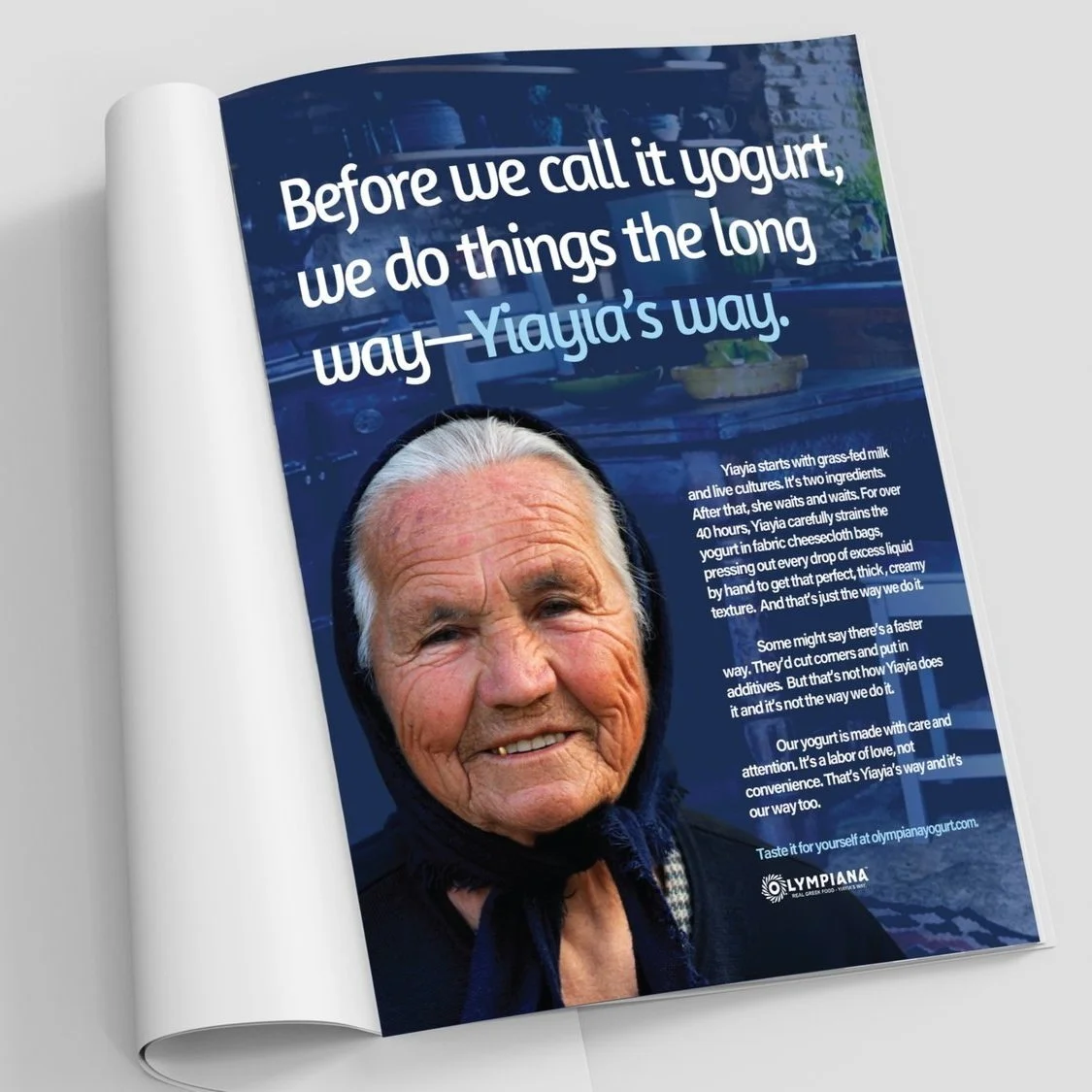 An ad in a recipe or kitchen magazine would show consumers that we take our time to make yogurt the best, yet tedious, way: YiaYia’s.